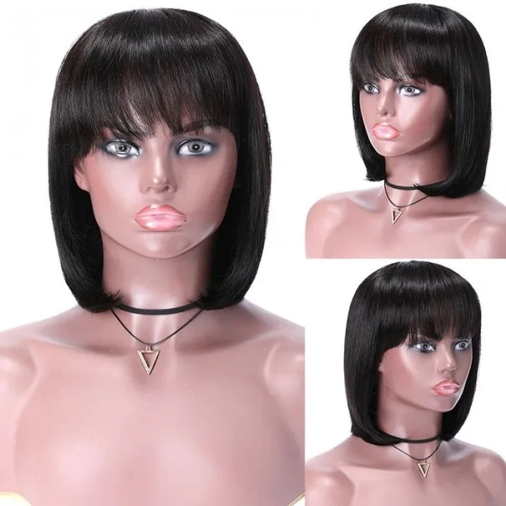 Bob Black Short Bob Human Hair 12 Inch Black Short Bob Human Hair With Bangs None Lace Front Machine Made Bob Party Cosplay Daily Use Walmart Com